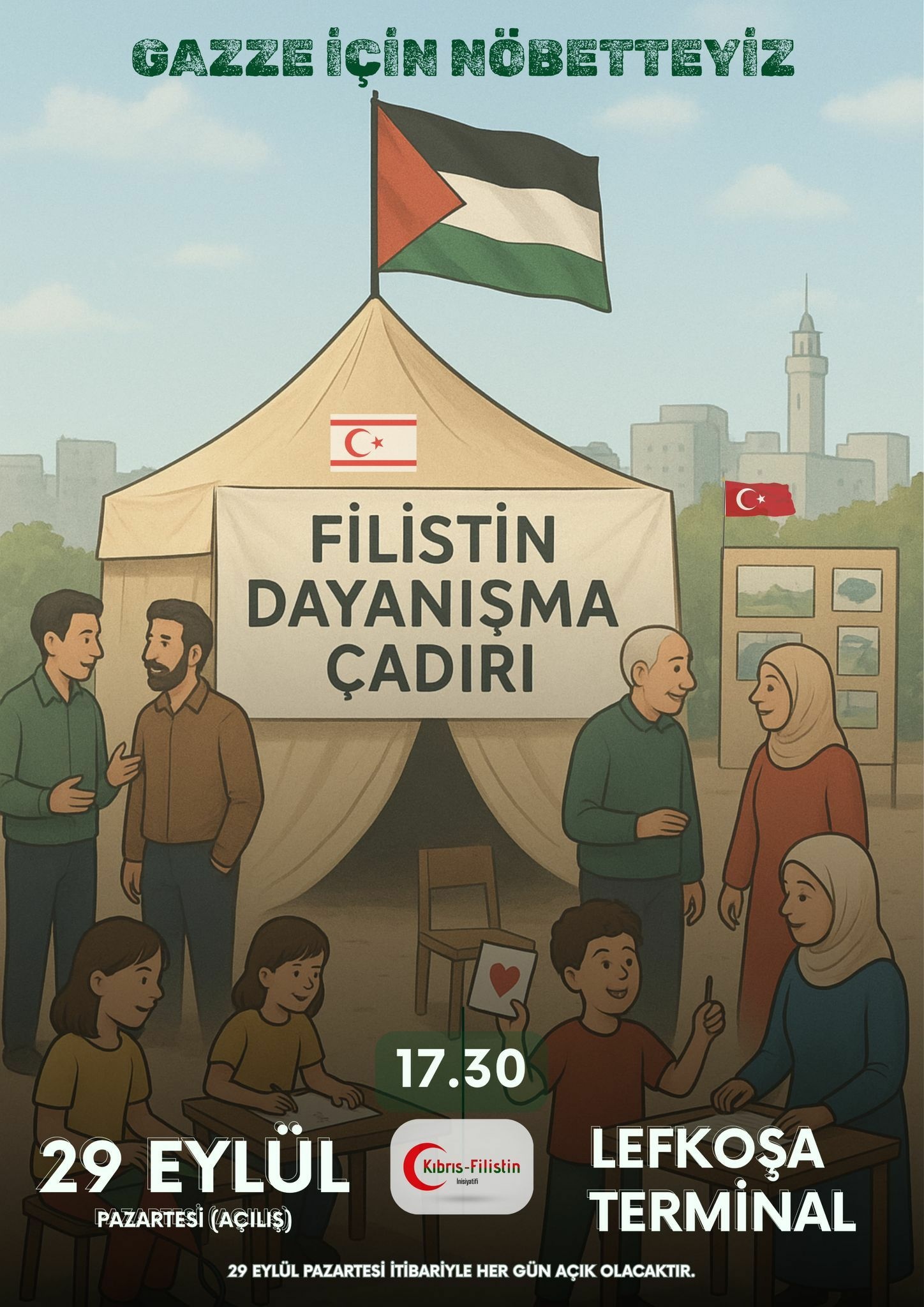Kıbrıs - Filistin İnisiyatifi, Filistin halkının sesi olmak, zulme karşı sessiz kalmamak ve vicdanların buluşma noktası olması amacıyla "Filistin Dayanışma Çadırı"nın açılışını bugün yapacak.