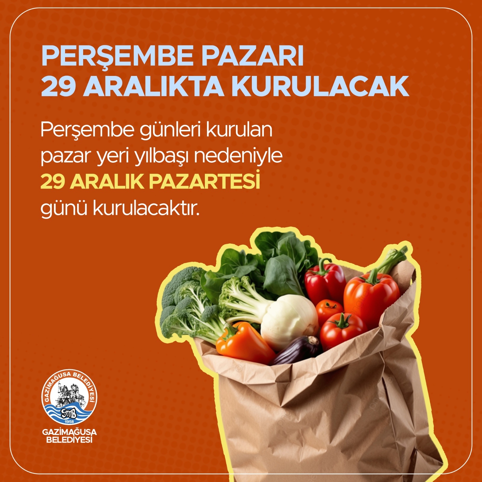 Gazimağusa Belediyesi, yeni yıl düzenlemeleri kapsamında, perşembe günleri kurulmakta olan Perşembe Pazarı'nın, bu hafta 29 Aralık Pazartesi günü kurulacağını duyurdu.