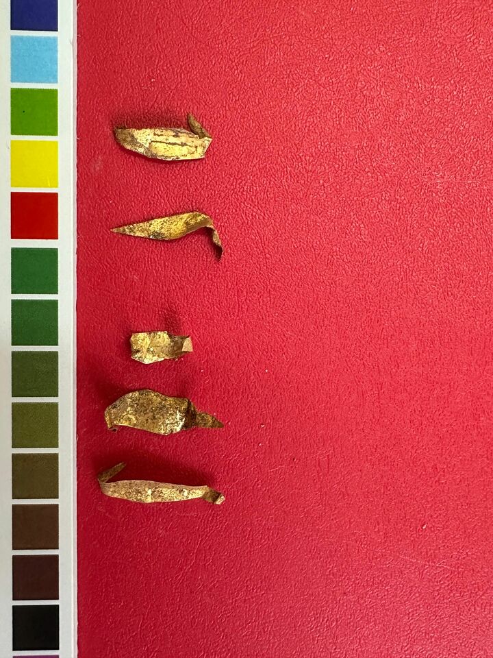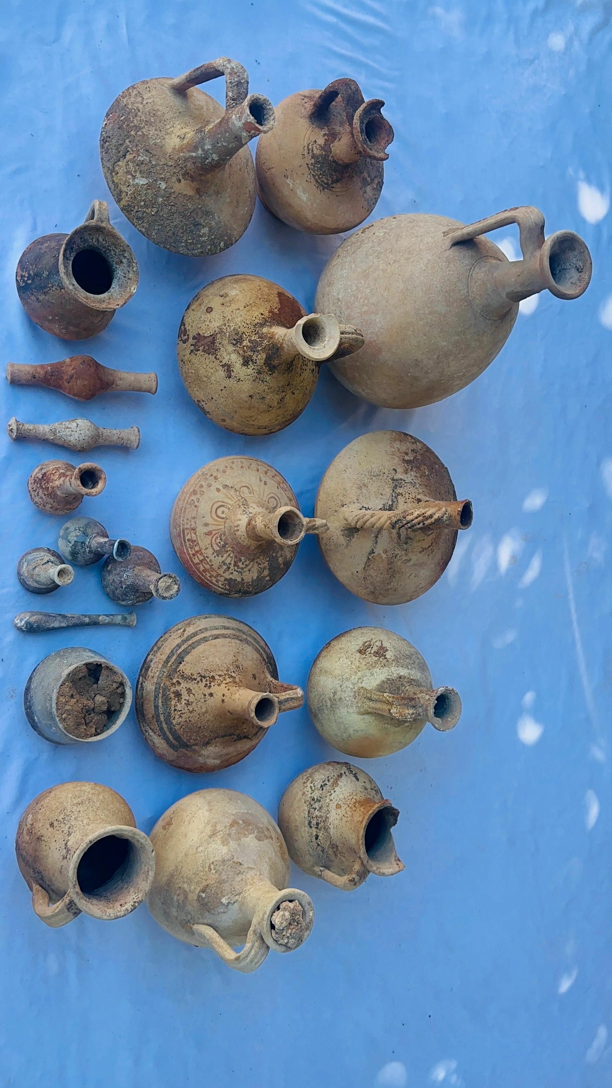Kazılarda; pişmiş toprak kase, kandil, lagynos (şarap boşaltmak için kullanılan kap türlerinden biri), unguentariumlar, çeşitli çanak çömlekler, cam unguentarium, tunç sikke ve iğne parçaları ile altın yaprakların yanı sıra mezar içerisinde insana ait kemik kalıntıları da bulundu.