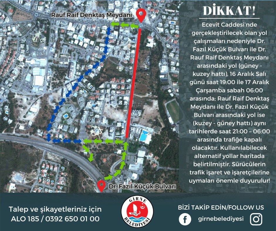 Girne Belediyesi, Ecevit Caddesi'nde bugün yapılacak yol çalışmaları kapsamında Dr. Fazıl Küçük Bulvarı ile Dr. Rauf Raif Denktaş Meydanı arasındaki bazı yolları yarın sabah saat 06.00'ya kadar trafiğe kapatacak.