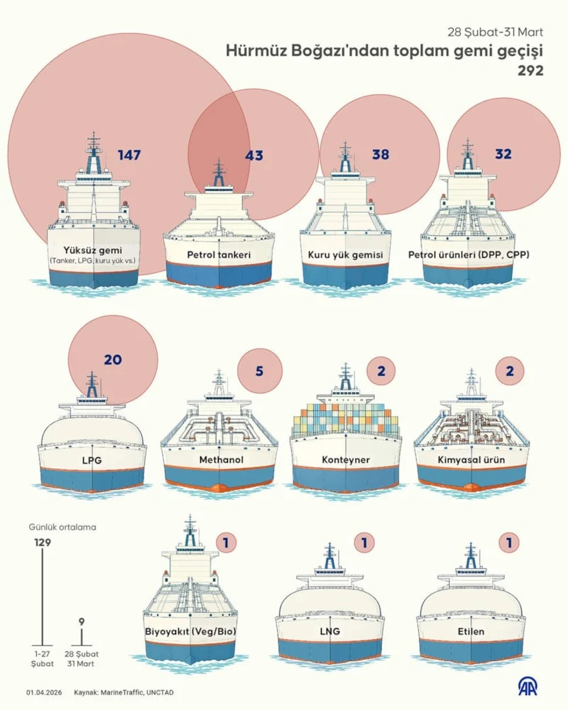 Hürmüz Boğazı’ndaki gemi trafiği, İran’ın misilleme adımları sonrası savaş öncesine göre yüzde 95 düştü. 28 Şubat-31 Mart arasında geçen 292 geminin 147’sinin boş olduğu bildirildi. Boğazdan günlük ortalama 130 gemi geçiyordu.