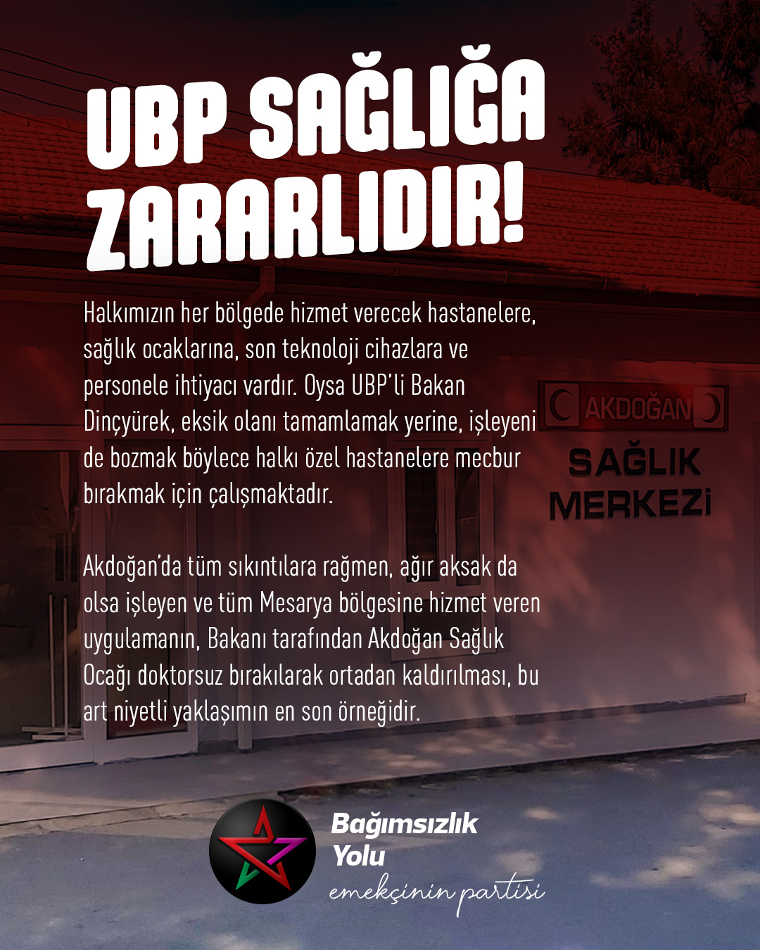 Bağımsızlık Yolu, Akdoğan Sağlık Merkezi’ndeki doktorun başka bir yere görevlendirilmesini eleştirerek, karardan geri dönülmesi çağrısı yaptı.