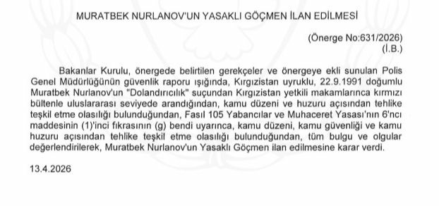 "Dolandırıcılık" suçundan hakkında kırmızı bülten bulunan Kırgızistan uyruklu Muradbek Nurlanov, "kamu düzeni ve güvenliği açısından tehdit oluşturduğu" gerekçesiyle Bakanlar Kurulu kararıyla yasaklı göçmen ilan edildi.