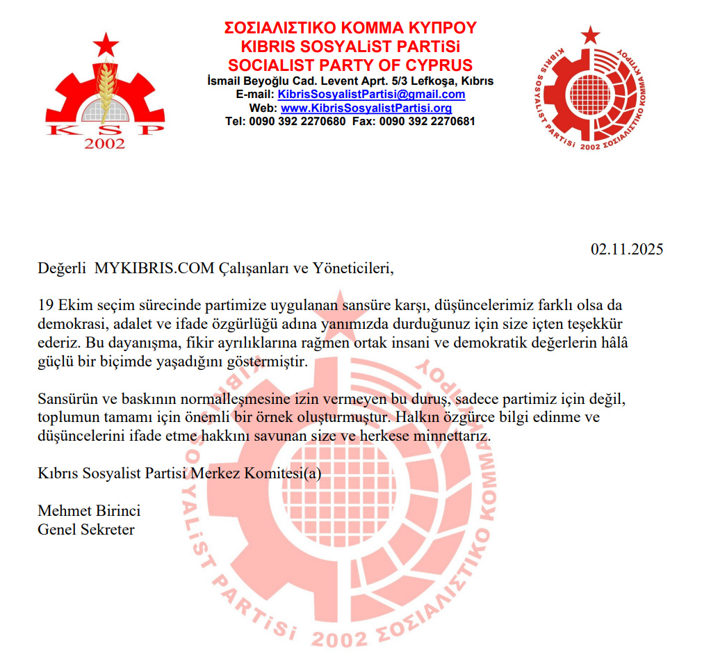 Kıbrıs Sosyalist Partisi (KSP), 19 Ekim seçim sürecinde partilerine yönelik uygulanan sansüre karşı demokrasi, adalet ve ifade özgürlüğü adına yanlarında duran MYK Haber çalışanları ve yöneticilerine teşekkür etti.