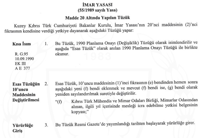 Tüzüğün, Şehir Planlama Dairesi’ne sunulan Mimari Avan Projeleri’nin Mimarlar Odası üyeleri tarafından çizilerek verilmesini garanti altına aldığına dikkat çekilen açıklamada, odanın, Güney Kıbrıs ve birçok Avrupa ülkesinde uygulanan bu sistemi ülkede inşaat sektörünün bürokratik yüklerini azaltmak ve süreci hızlandırmak için talep ettiği vurgulandı.