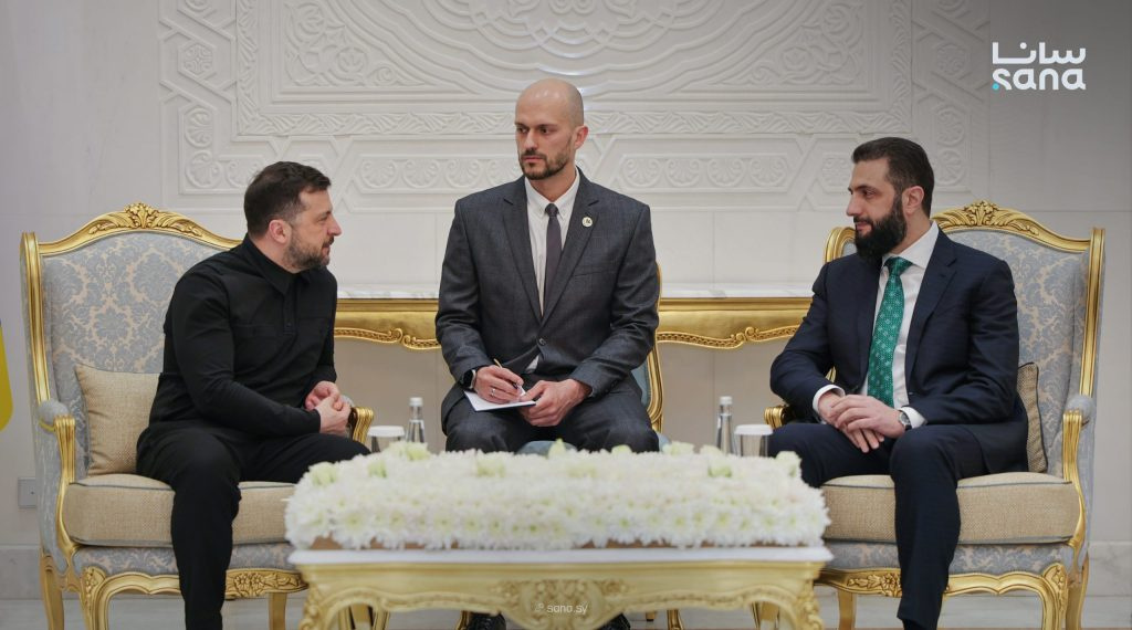 Suriye Cumhurbaşkanı Ahmed El-Şara, Şam’daki Halk Sarayı’nda gerçekleştirilen görüşmede Zelenskiy’i kabul etti. Görüşmeye her iki ülkenin bakanlar heyetleri de katıldı. Türkiye Dışişleri Bakanı Hakan Fidan’ın da hazır bulunduğu toplantıda, ikili ilişkilerin güçlendirilmesi ve ekonomik işbirliği yolları ele alındı.