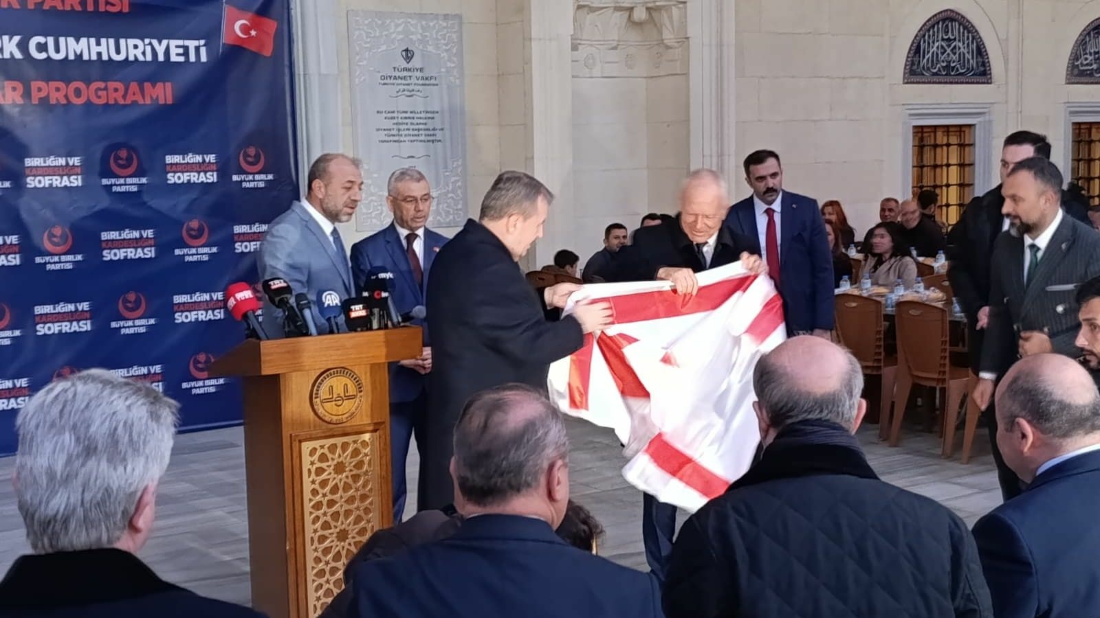 Eski Meclis Başkanı Zorlu Töre, BBP Genel Başkanı Mustafa Destici'ye bayrak hediye etti.