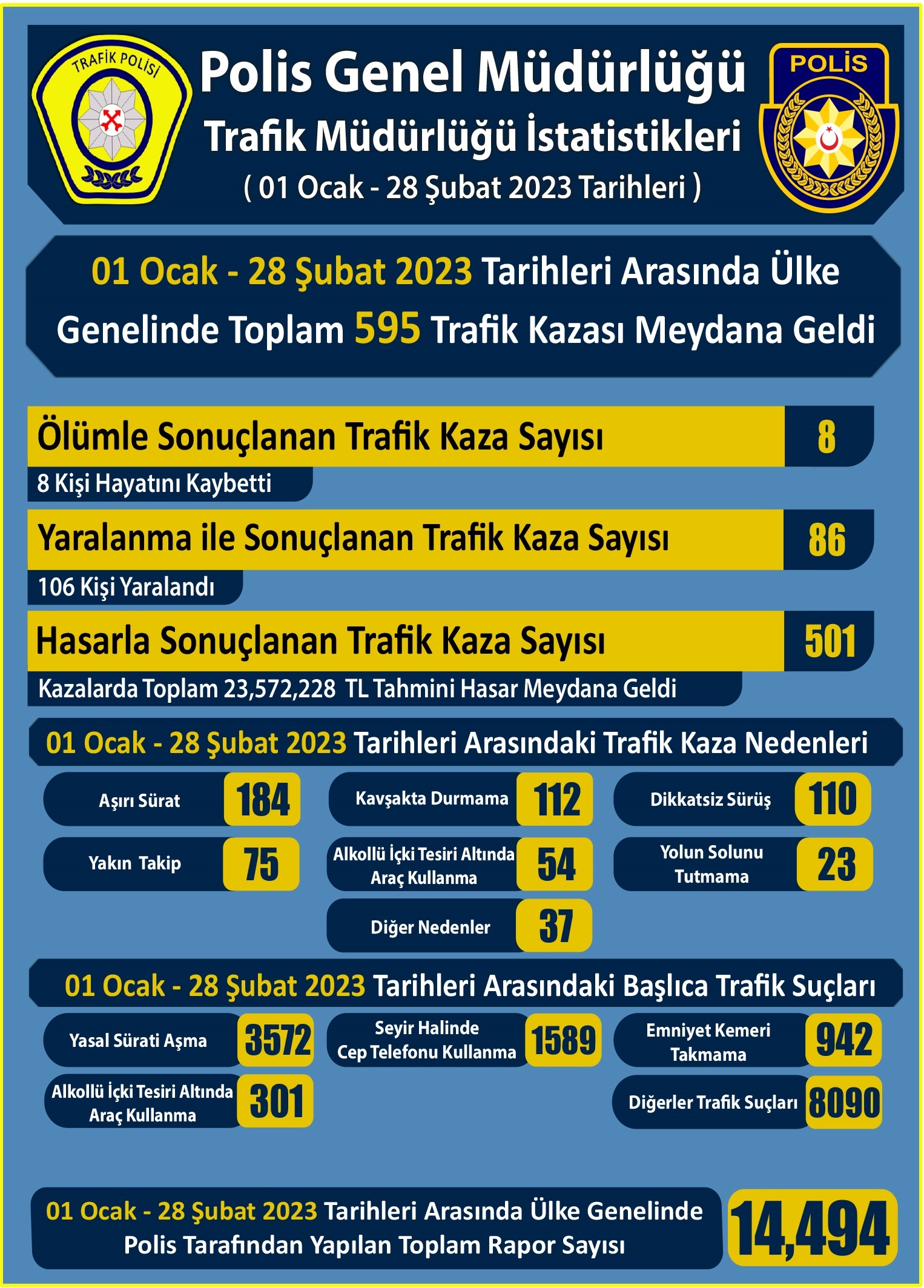 Polis Genel Müdürlüğü, 1 Ocak-28 Şubat tarihlerini kapsayan trafik istatistiklerini yayımladı.