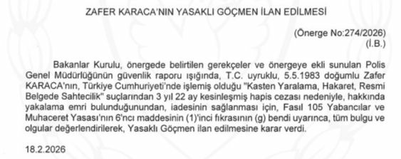 Resmi Gazete'nin 19 Şubat tarihli sayısında yer alan karara göre, Bakanlar Kurulu, Karaca'nın Fasıl 105 Yabancılar ve Muhaceret Yasası'nın 6'ncı maddesinin (1)'inci fıkrasının (g) bendi uyarınca, tüm bulgu ve olgular değerlendirilerek yasaklı göçmen ilan edilmesine karar verdi.