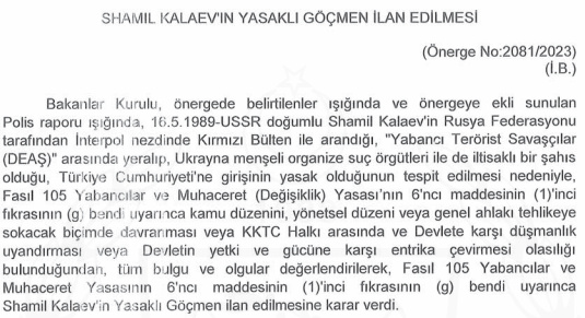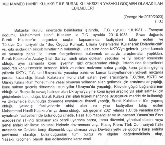 Dünkü Resmi Gazete'de yer alan kararlarda, yasaklı göçmen ilan edilen kişiler; haklarında, uyuşturucu ve silah ticareti, yasa dışı bahis ve kumar gibi çok sayıda suç kaydı bulunduğu belirtilen Türkiye Cumhuriyeti vatandaşı Muhammed Hanifi Kulaksız ve Burak Kulaksız kardeşler ile Rusya'nın terör örgütü IŞİD üyesi olduğu gerekçesiyle Interpol nezdinde kırmızı bültenle aradığı belirtilen Shamil Kalaev oldu.
