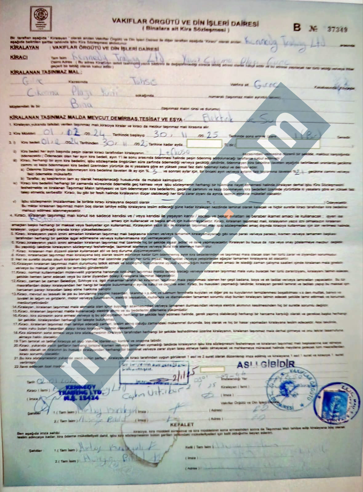 Sözleşmede taraflar olarak Kennedy Trading Ltd. ile Maliye Bakanlığı'na bağlı Gelir ve Vergi Dairesi ve Vakıflar Örgütü ve Din İşleri Dairesi'nin mühürleri yer alıyor.