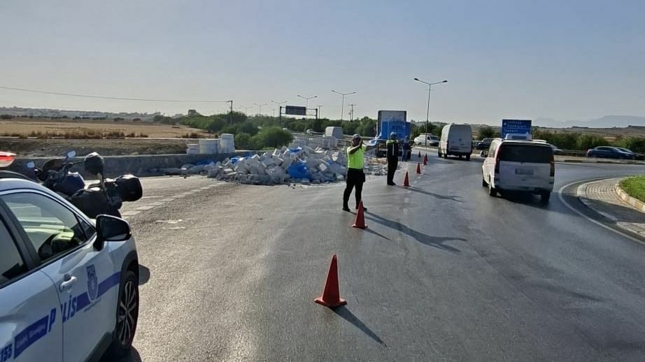Haspolat bölgesindeki Halkbank çemberi üzerinde Lefkoşa istikametine seyreden bir tırdan yüklü gaz beton tuğlalar, çember çıkışında sol şeride devrildi.