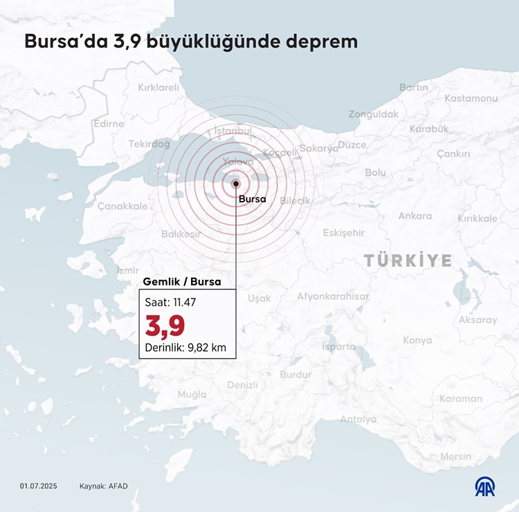 Bursa Valiliğinden yapılan açıklamada, "İlimizde saat 11.47'de, merkez üssü Gemlik olan 3.9 büyüklüğünde deprem meydana gelmiş olup, deprem sonrası olumsuz bir durum tespit edilmemiştir. Kamuoyuna saygıyla duyurulur." ifadelerine yer verildi.