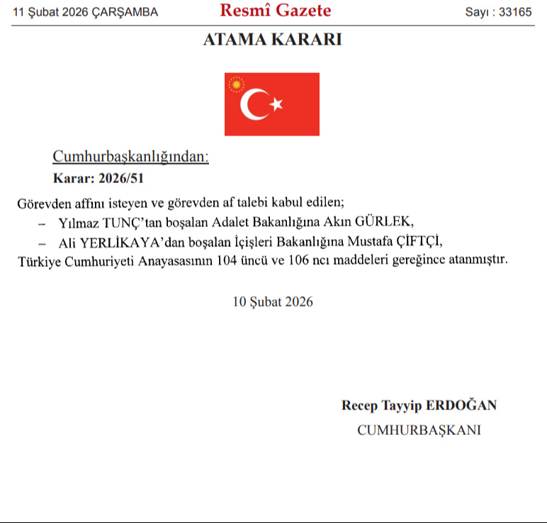 Yılmaz Tunç’tan boşalan Adalet Bakanlığı görevine İstanbul Cumhuriyet Başsavcısı Akın Gürlek, Ali Yerlikaya’dan boşalan İçişleri Bakanlığı görevine ise Erzurum Valisi Mustafa Çiftçi atandı.