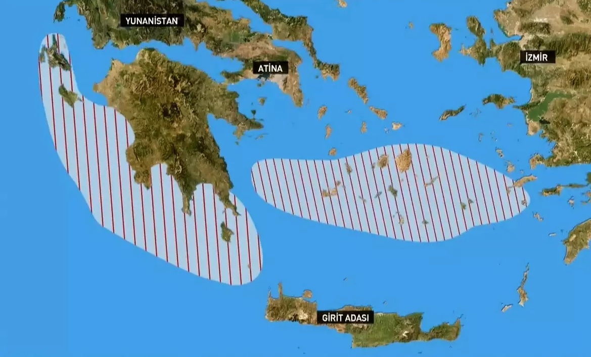 Kısaca özetlemek gerekirse, Yunanistan deniz yetki alanlarının "orta hat" ilkesine göre belirlenmesi gerektiğini ve adaların da kendilerine ait karasuları olduğunu savunuyor. Böylelikle orta hat çizgisinin, olması gereken ana karalar değil, Yunan adalarından itibaren uygulanması gerektiğini öne sürerek Türkiye'nin yaklaşık 104 bin kilometre karelik deniz alanını "gasp etmeyi" hayal ediyor.