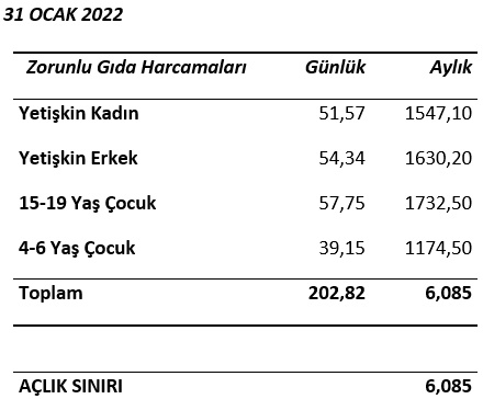 KTAMS, ocak ayında 4 kişilik ailenin açlık sınırının 6 bin 85 TL'ye yükseldiğini duyurdu. 2021 Aralık ayında bu rakam 5 bin 774 TL olarak hesaplanmıştı.