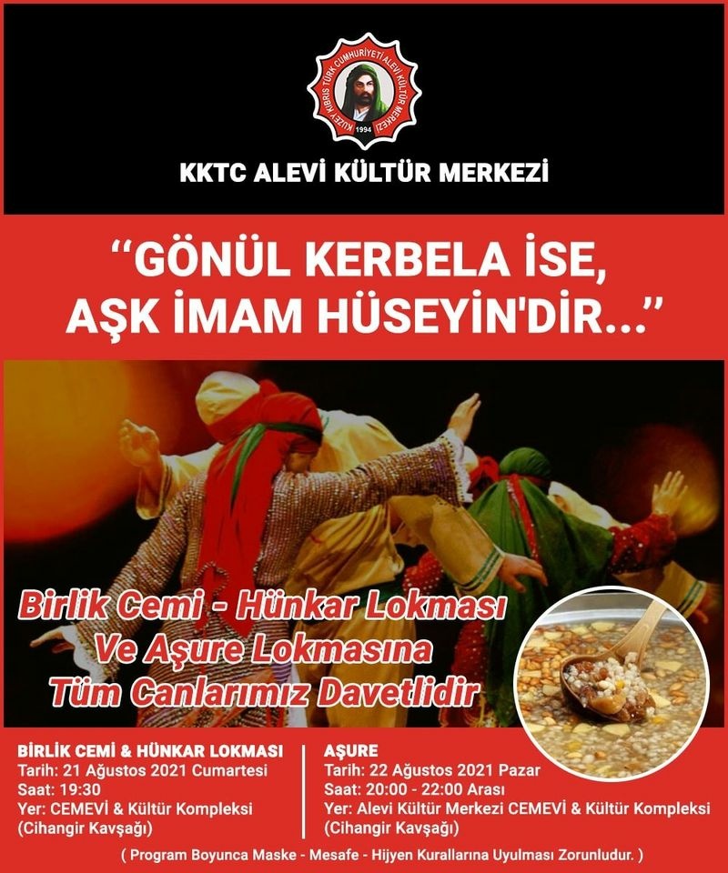 KKTC Alevi Kültür Merkezi, pazar günü saat 20.00’de Cemevi ve Kültür Kompleksi’nde “Aşure Lokması” etkinliği düzenleyecek.