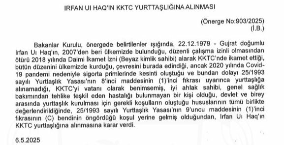 "Bakanlar Kurulu, önergede belirtilenler ışığında, 22.12.1979 - Gujrat doğumlu irfan Uı Haq'ın , 2007'den beri ülkemizde bulunduğu, düzenli çalışma izinli olmasından ötürü 2018 yılında Daimi İkamet İzni (Beyaz kimlik sahibi) alarak KKTC'de ikamet ettiği, bütün düzenini ülkemizde kurduğu , çevresini burada edindiği, ancak 2020 yılında Covid-19 pandemi nedeniyle sigorta primlerinde kesinti oluştuğu ve bundan dolayı 25/1993 sayılı Yurttaşlık Yasası'nın 8'inci maddesinin (1 )'inci fıkrası uyarınca yurttaşlığa alınamadığı, KKTC'yi vatanı olarak benimsemiş, iyi ahlak sahibi, genel sağlık bakımından tehlike teşkil eden hastalığı bulunmayan bir kişi olduğu, devlet ve birey arasında yurttaşlık kurulması için gerekli koşulların oluştuğu hususlarının tümü birlikte değerlendirildiğinde, 25/1993 sayılı Yurttaşlık Yasası’nın 9'uncu maddesinin (1 )'inci fıkrasının (C) bendinin öngördüğü koşul yerine gelmiş olduğundan, irfan Uı Haq'ın KKTC yurttaşlığına alınmasına karar verdi."