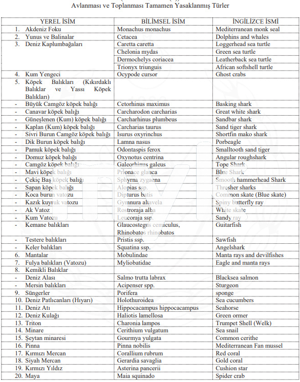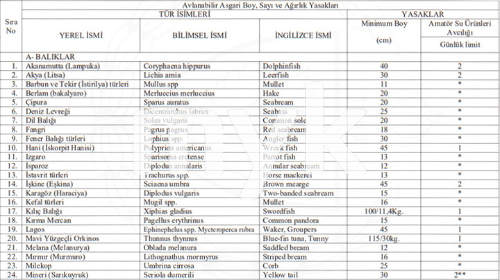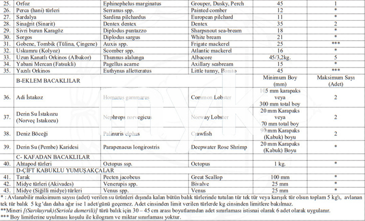 35'i balık, 8'i eklem bacaklı 43 türün avlanmasına izin verildi. Bu türlerin avlanması için gerekli olan minimum boylar ve günlük av adeti de tüzükle belirlendi.