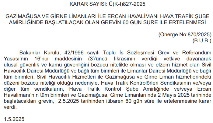 Bakanlar Kurulu, Gazimağusa ve Girne limanları ile Ercan Havalimanı birimlerinde bugün yapılması beklenen grevleri 60 gün süreyle erteledi.
