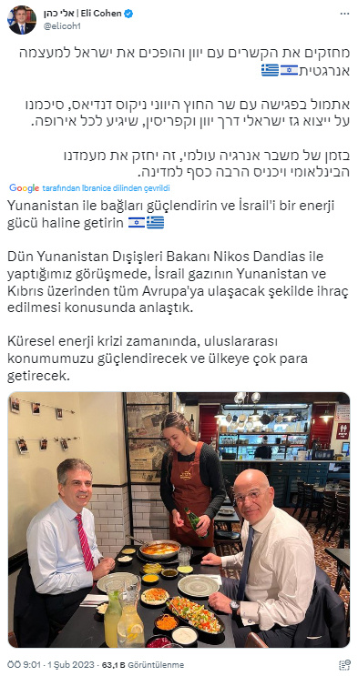 "Dün Yunanistan Dışişleri Bakanı Nikos Dandias ile görüşmede İsrail gazını Yunanistan ve Kıbrıs üzerinden tüm Avrupa'ya ulaşacak şekilde ihraç etme konusunda anlaştık. Küresel enerji krizi muhafazası, uluslararası duruşumuz güçlenecek ve iki ülke arasında yapılan anlaşma İsrail'e çok para kazandıracak."