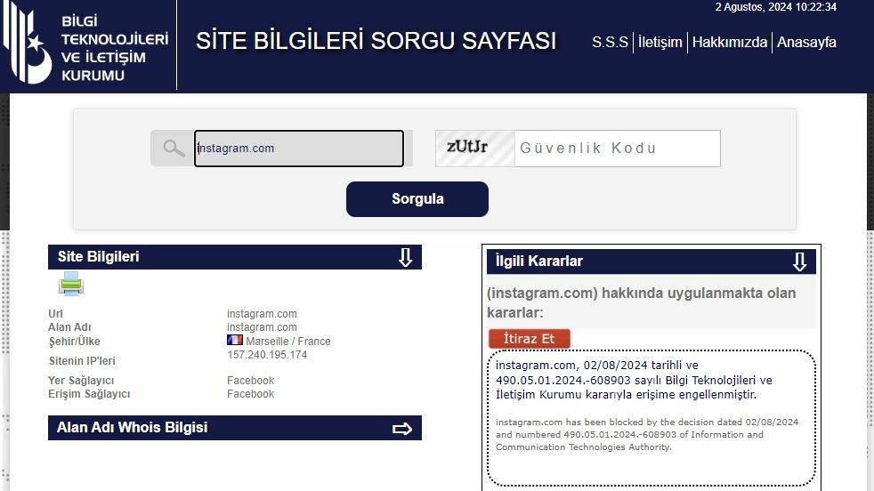 Karar sonrası Türkiye'den Instagram'a erişim sağlanamıyor. BTK'nın internet sitesinde erişim engelinin süresine ilişkin bilgi yer almıyor.