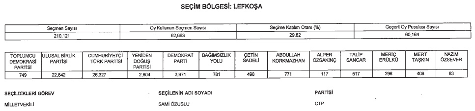 Geçerli oyların 26 bin 327'sini alan Cumhuriyetçi Türk Partisi (CTP) adayı Sami Özuslu, Lefkoşa Milletvekili seçildi.