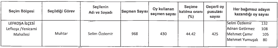 Lefkoşa Yenicami Mahallesi muhtarlığı için toplam seçmen sayısının 968 olduğu seçimlerde, 430 seçmen oy kullandı. Geçerli oy pusulası sayısının 425 olduğu seçimlerde, katılım oranı yüzde 44.42 olarak belirlendi.