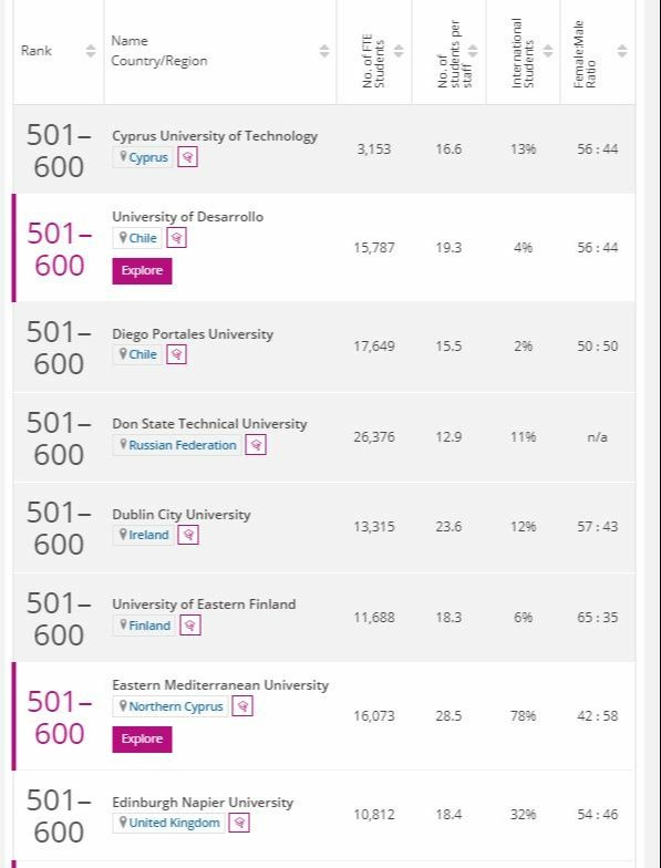 Yeni listede Kıbrıs’ın iki üniversitesi "Kuzey Kıbrıs" adı altında sınıflandırılırken, Güney'deki üç kolej "Kıbrıs" adıyla listelendi. Güney Kıbrıs’ta bulunan Kıbrıs Üniversitesi adanın en üst sıradaki üniversitesi oldu ve 401-500 bandında yer aldı. DAÜ, adada Kıbrıs Üniversitesi'nden sonra en iyi ikinci üniversite oldu ve 501-600 bandında yer aldı. Kıbrıs Teknoloji Üniversitesi, Lefkoşa Üniversitesi ve YDÜ de bu sırayı izledi.
