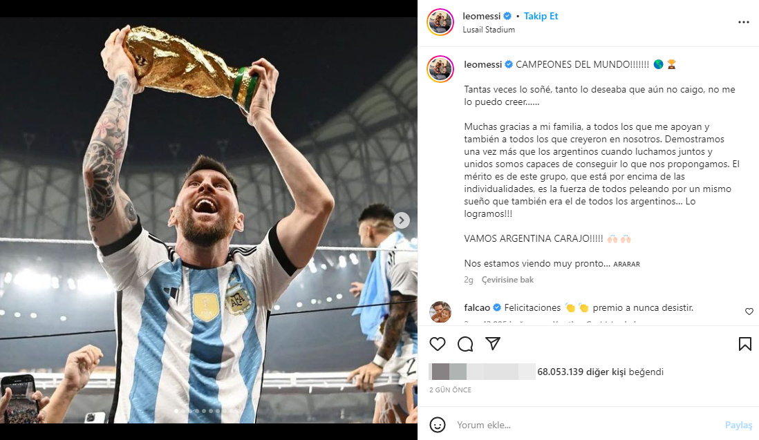 Arjantin'in 36 yıl sonra FIFA Dünya Kupası'nı kazanmasında başrolü oynayan Lionel Messi'nin paylaştığı kupalı fotoğraf, Instagram'da beğenilme rekoru kırdı.
