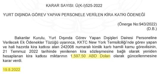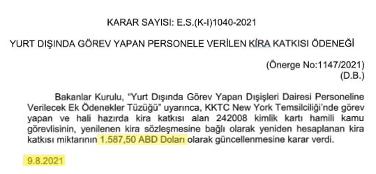 Bakanlar Kurulu, KKTC New York Temsilciliği'nde görevli personelin kira katkı ödeneğini güncelledi.