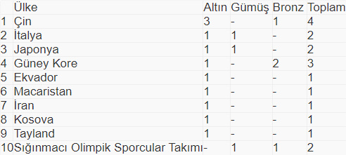 Olimpiyatlarda ilk gün sonunda madalya tablosunun zirvesindeki 10 ülke şöyle: