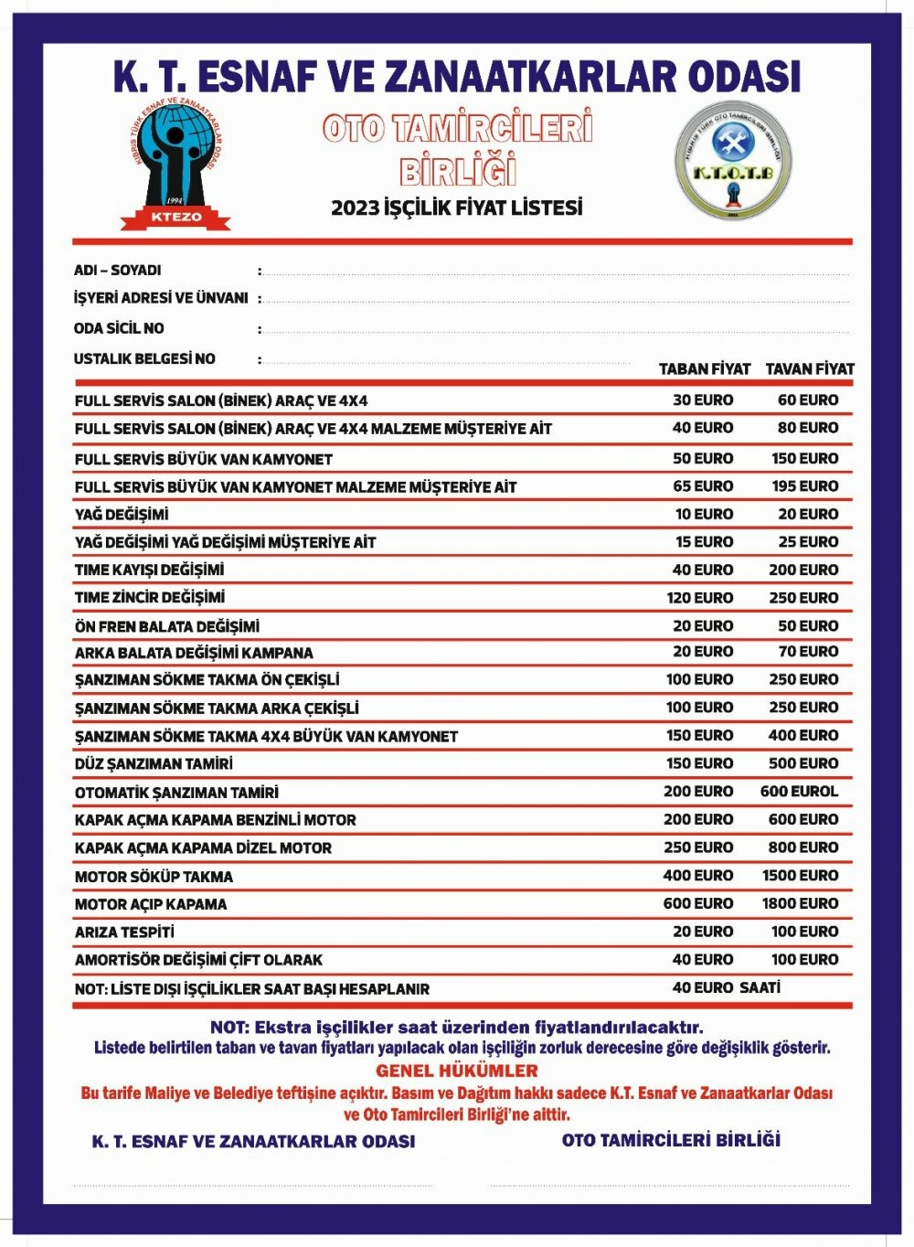 Kıbrıs Türk Esnaf ve Zanaatkarlar Odası’na (KTEZO) bağlı Oto Tamircileri Birliği, 2023 yılı işçilik fiyat listesini euro olarak açıkladı.