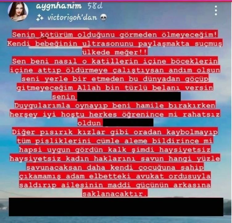 Aygün yaptığı paylaşımda, "Senin kötürüm olduğunu görmeden ölmeyeceğim! Sen beni nasıl o katillerin içine böceklerin içine atıp öldürmeye çalıştıysan, andım olsun seni yerle bir etmeden bu dünyadan göçüp gitmeyeceğim" ifadelerine yer vermişti.