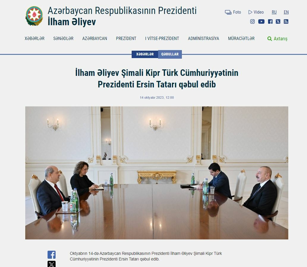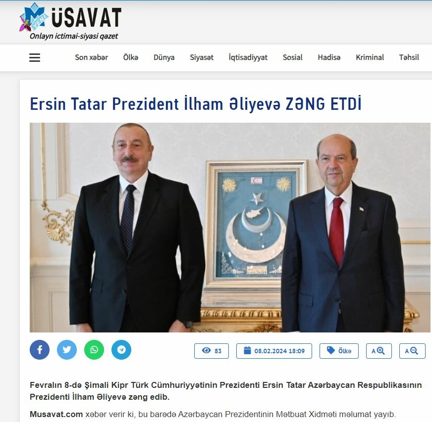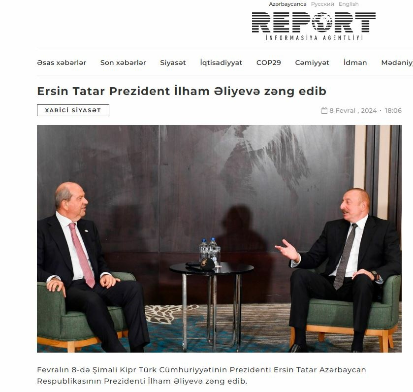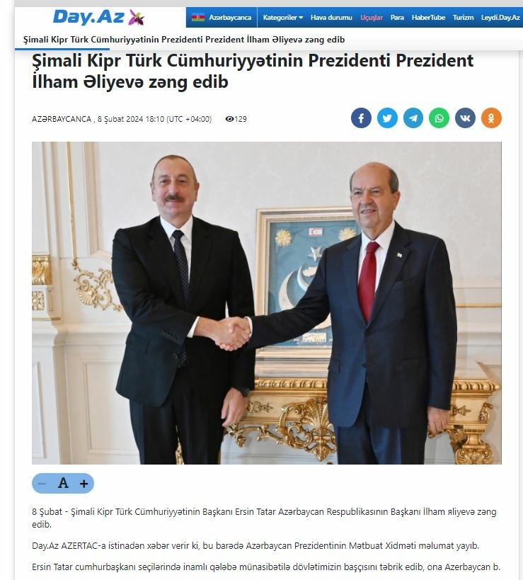 Cumhurbaşkanı Ersin Tatar, Azerbaycan Cumhurbaşkanlığına yeniden seçilen İlham Aliyev ile telefon görüşmesi yaptı. Görüşme, Azerbaycan yayın organlarında geniş yer verildi.