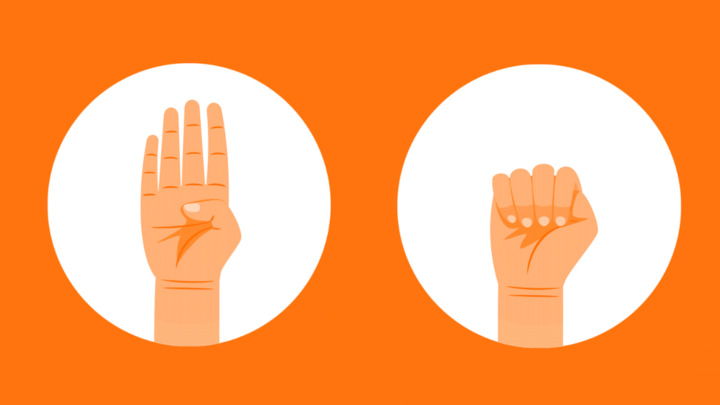 Söz konusu işarette el, avuç içi karşı tarafa gösterilecek şekilde kaldırılıyor. Önce baş parmak sonra da geri kalan parmaklar avuç içine doğru katlanıyor.