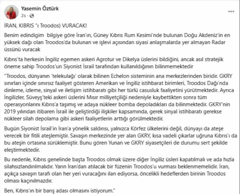 UBP Milletvekili Yasemin Öztürk, edindiği bilgiyi sosyal medya hesabından paylaşarak "İran'ın Trodos'u vuracağını" iddia etti.