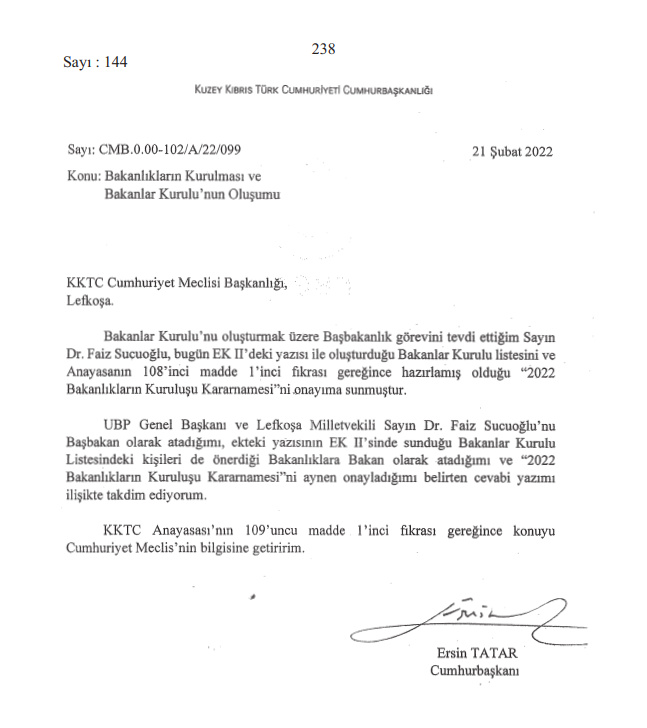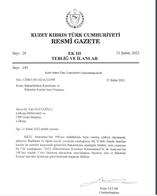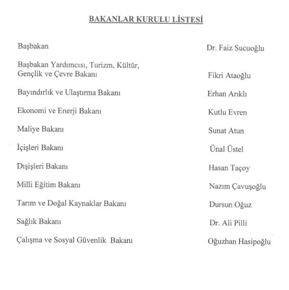 Ulusal Birlik Partisi (UBP) Genel Başbakanı Faiz Sucuoğlu başkanlığındaki yeni üçlü hükümetin Bakanlar Kurulu listesi önce Cumhurbaşkanı Ersin Tatar tarafından onaylandı.