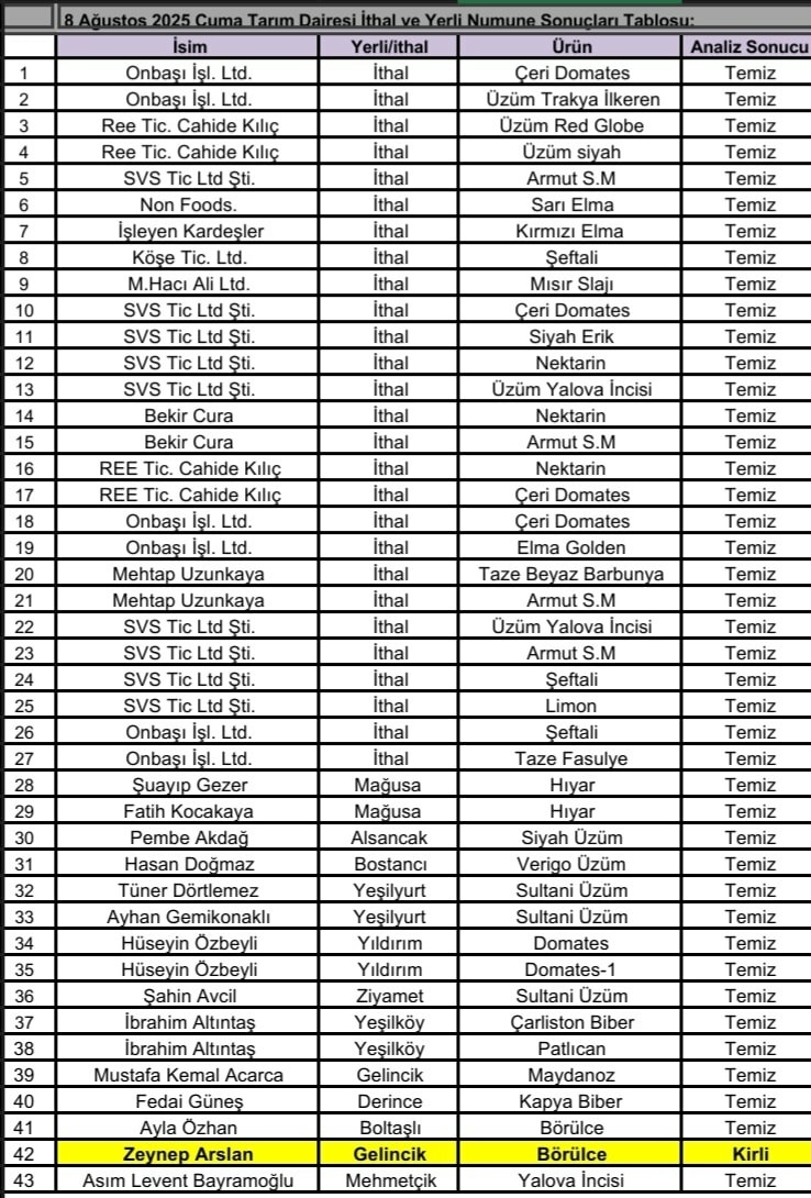 Analizi yapılan ithal ürün numuneleri temiz çıkarken, bir yerli börülcede, tavsiye dışı bitki koruma ürünü tespit edildi.
