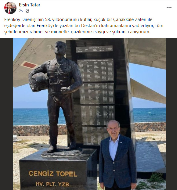 Cumhurbaşkanı Tatar, Kıbrıs'taki ilk Türk hava harp şehidi olan Cengiz Topel'in anıtının önünde yaptığı paylaşımda, Erenköy Direnişi’nin kahramanlarını andı.
