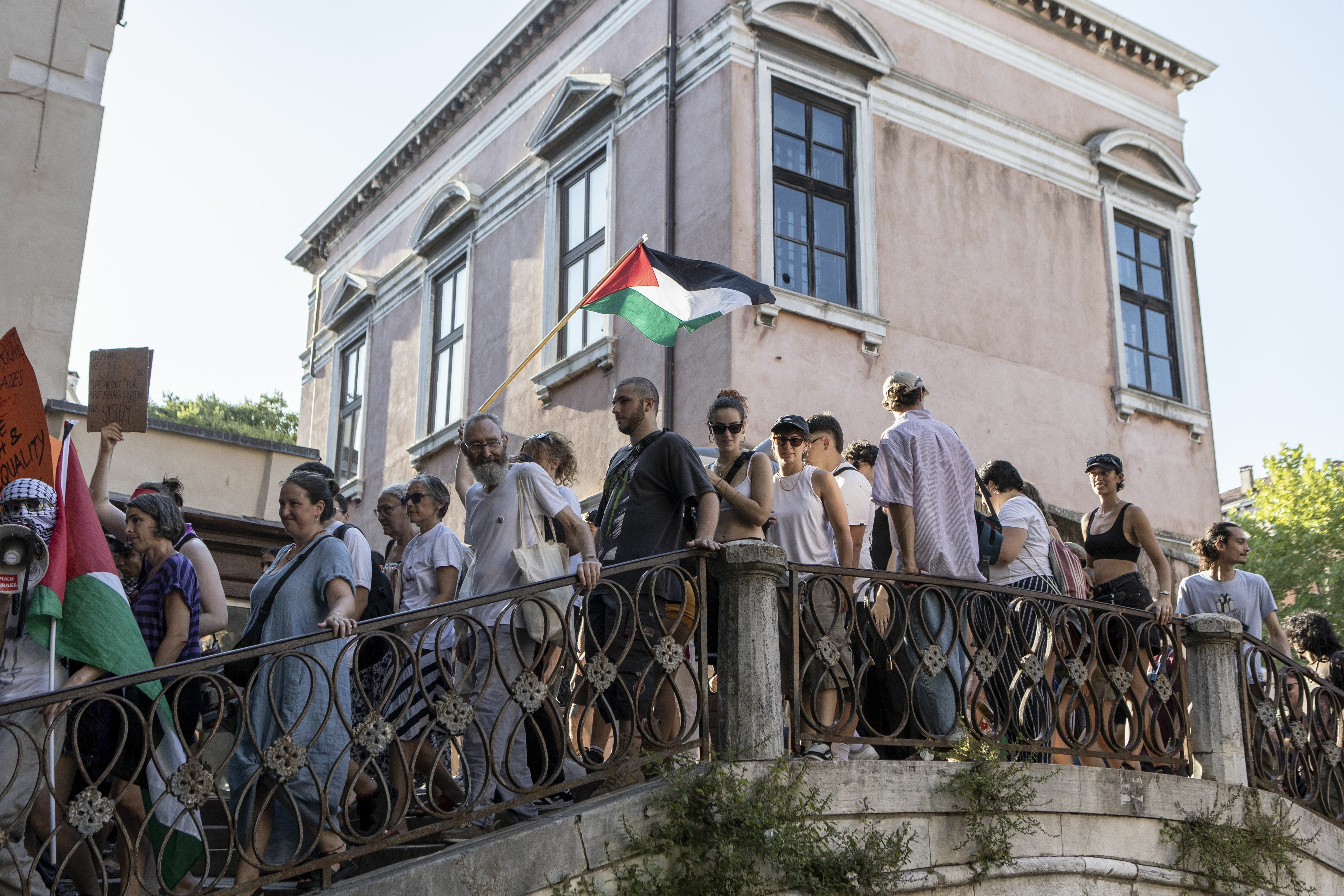 Venedik'in dar sokakları ve küçük meydanları boyunca yürüyen grup, sık sık Bezos’a ve küreselleşmeye karşı sloganlar ve Filistin lehine sloganlar attı.