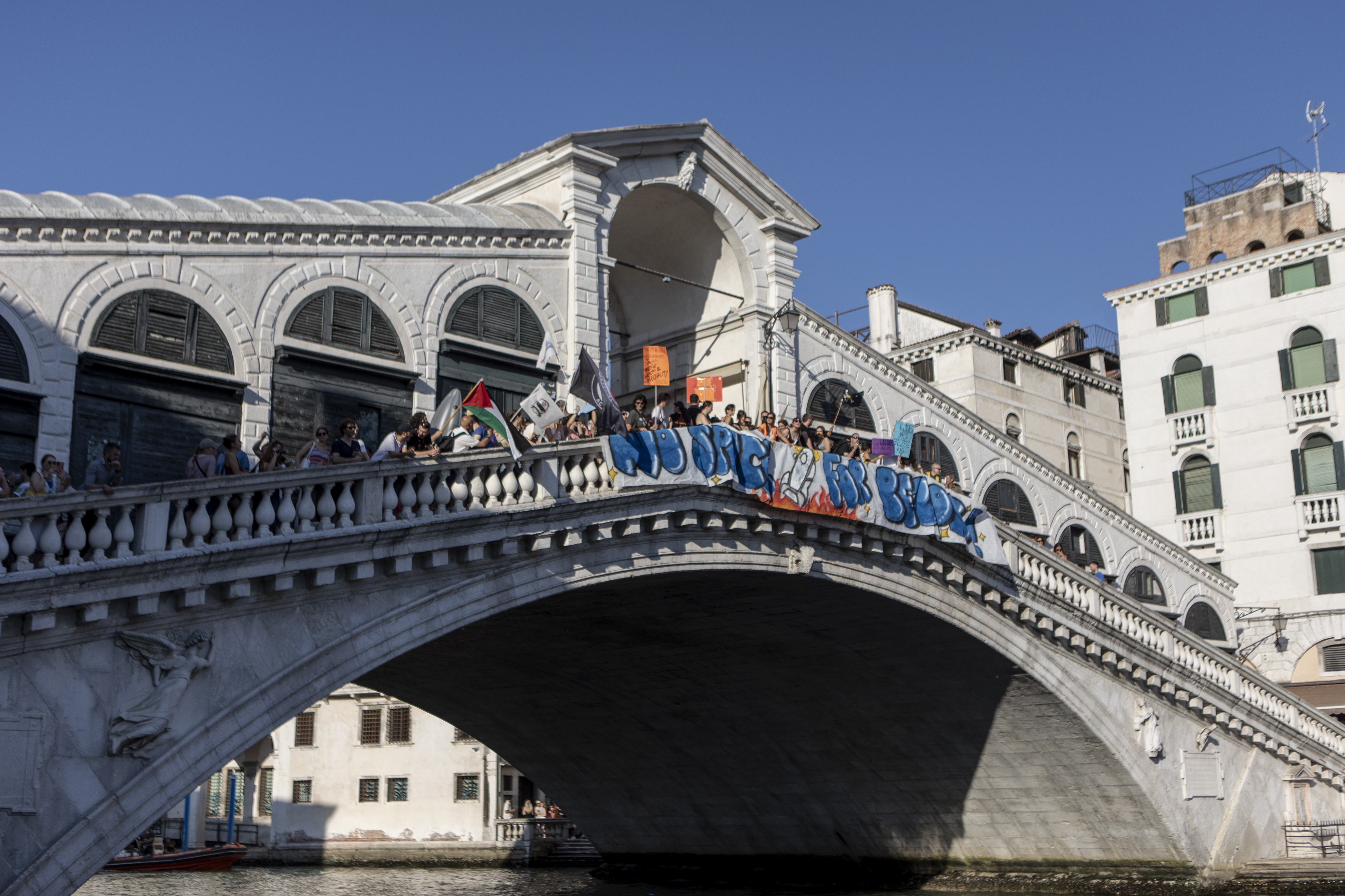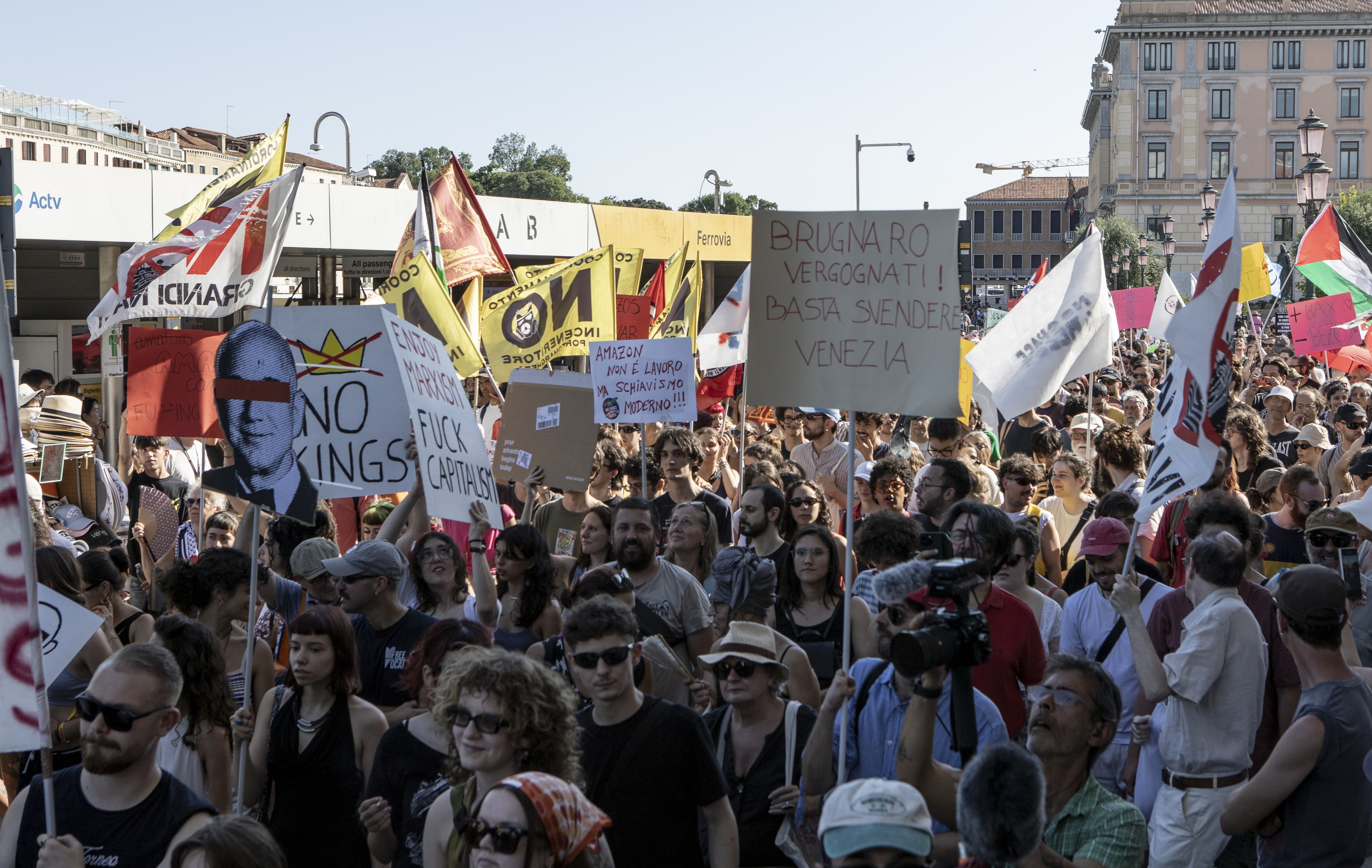 1000 civarında kişi, Bezos çiftinin düğününe karşı açtıkları pankartlarla merkez tren garı olan Santa Lucia İstasyonu’ndan kentin simge yapılarından Rialto Köprüsü’ne kadar yürüdü.