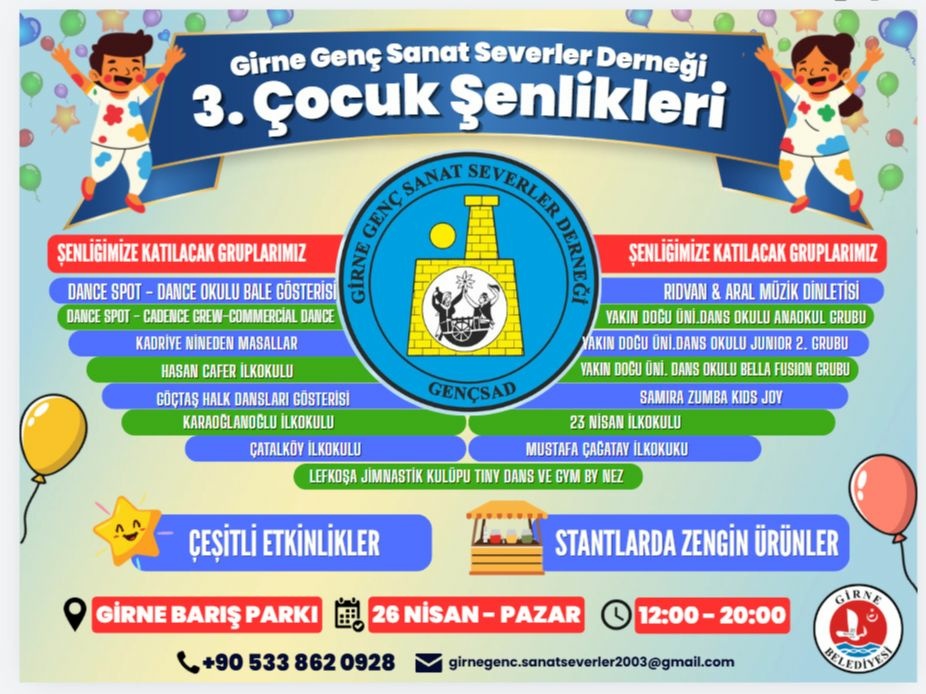 Girne Genç Sanat Severler Derneği'nin çocuklara yönelik düzenlediği "3'üncü Çocuk Şenlikleri" etkinliği, 26 Nisan Pazar günü Girne'de Sevim Ebeoğlu Barış Parkı'nda gerçekleştirilecek.