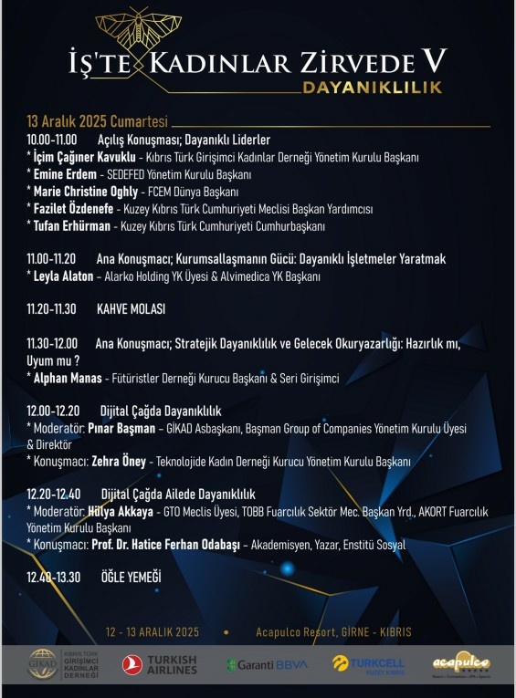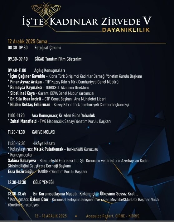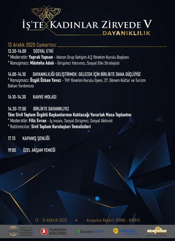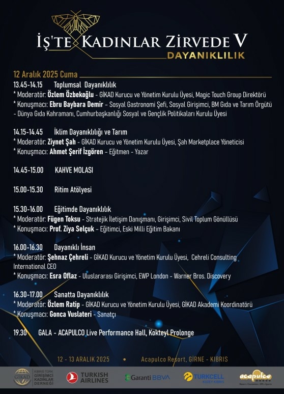 Kıbrıs Türk Girişimci Kadınlar Derneği (GİKAD) tarafından bu yıl beşincisi düzenlenen “İş’te Kadınlar Zirvede” buluşması, 12–13 Aralık tarihlerinde Girne Acapulco Resort Hotel’de gerçekleştirilecek.