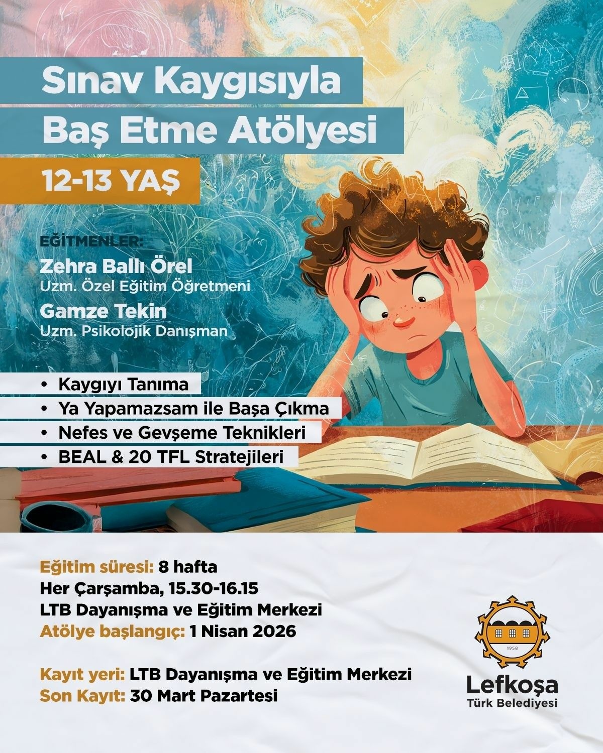 Lefkoşa Türk Belediyesi (LTB), 12-13 yaş grubuna yönelik "Sınav Kaygısıyla Baş Etme Atölyesi" düzenleyecek.