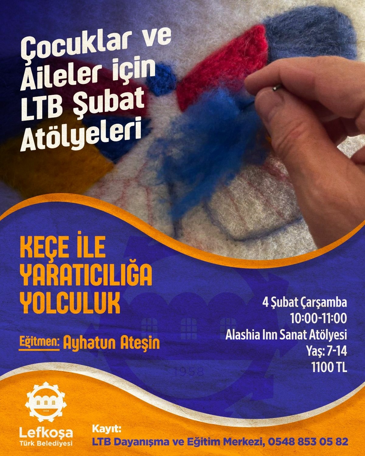 Keçe ile Yaratıcılığa Yolculuk: Eğitmen Ayhatun Ateşin rehberliğinde, 4 Şubat Çarşamba günü 10.00-11.00 saatlerinde Alashia Inn Sanat Atölyesi'nde yapılacak. (7-14 yaş | 1100 TL).