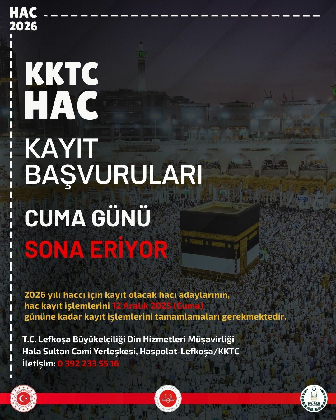 2026 yılında hacca gitmek isteyenler için ön kayıt işlemleri 12 Aralık Cuma günü sona erecek. Kontenjanla sınırlı kayıtlar, TC Lefkoşa Büyükelçiliği Din Hizmetleri Müşavirliği'ne şahsen yapılacak.