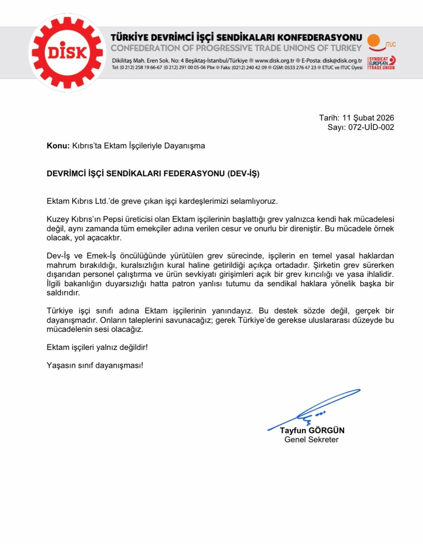 Türkiye Devrimci İşçi Sendikaları Konfederasyonu (DİSK), Ektam Kıbrıs Ltd.’de greve çıkan işçilere destek mesajı göndererek dayanışma çağrısında bulundu.