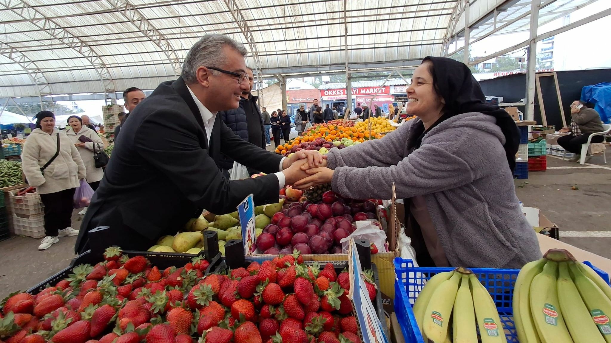 Pazarda esnafı tek tek dolaşan Erhürman, esnaf ile halkla selamlaşıp sohbet etti ve fotoğraf çektirdi.