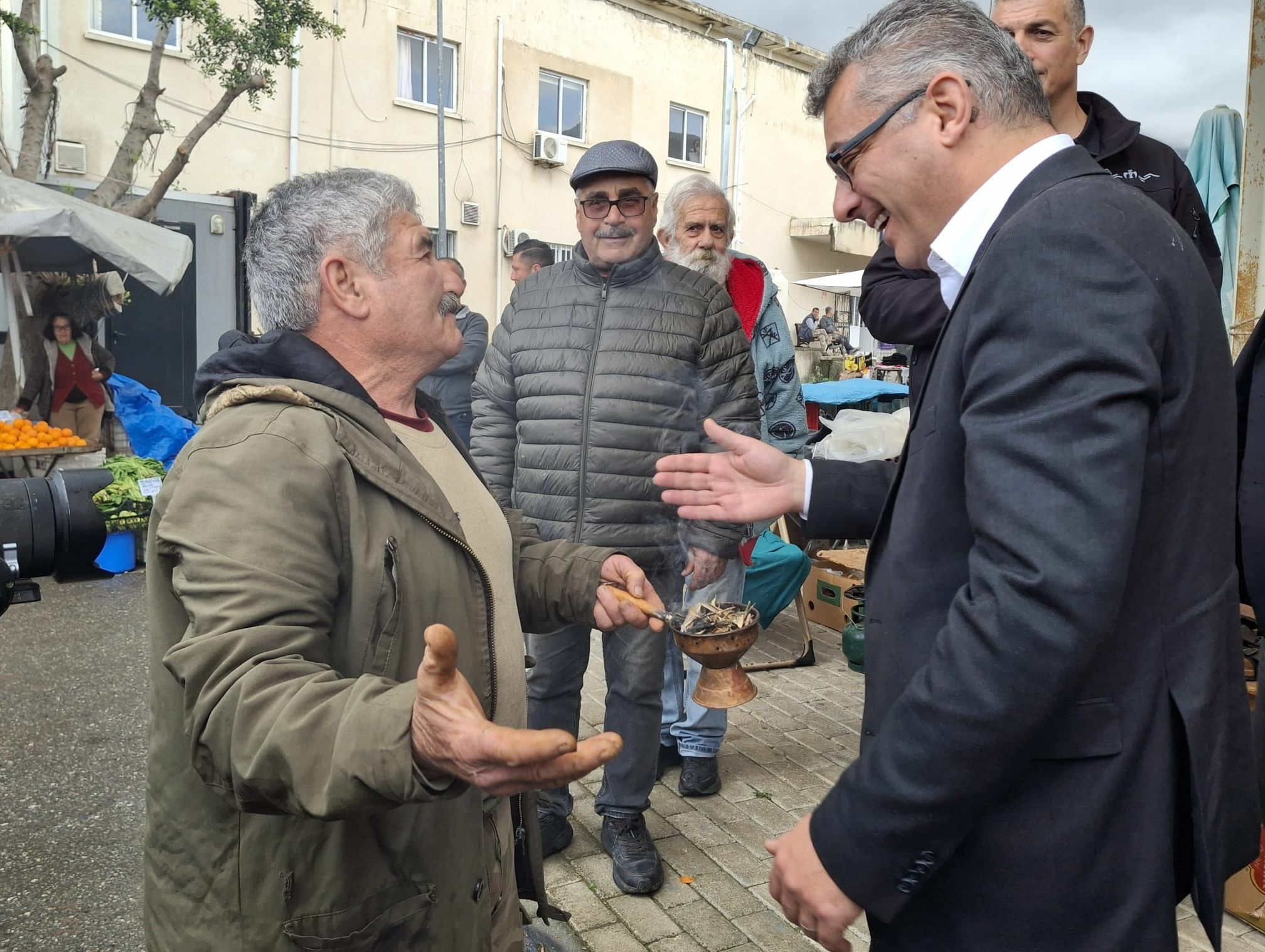 Ziyaret sırasında bir esnaf ise Kıbrıs'ın adetleri arasında yer alan tütsü yakarak Erhürman'ı tütsüledi.